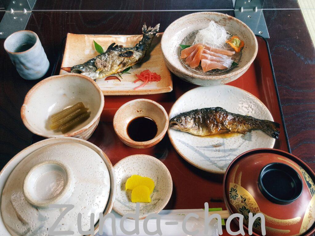 Around 14:00, when it’s not so crowded, I had the river fishes raised in the spring water! On the left side it was a salt-grilled char, on the right side it was a rainbow trout sweetened boiled, and rainbow trout sashimi! There was no smell, it was easy to eat, and very tasty!